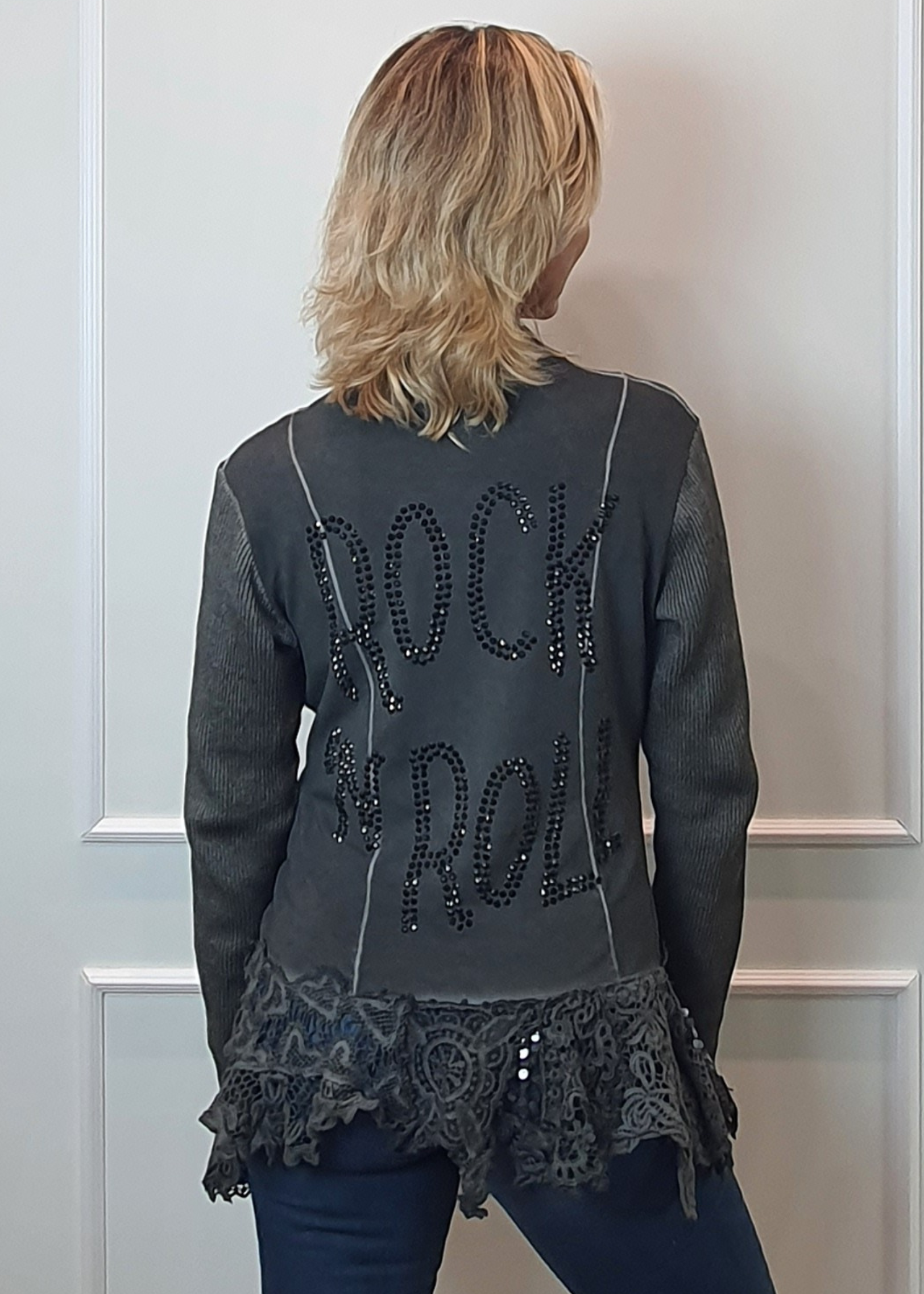 Design e Qualidade: Confeccionada em moletinho premium (96% Viscose, 4% Elastano), a jaqueta oferece um toque macio e o conforto ideal para o seu dia a dia. Sua pedraria de Rock 'N Roll e os detalhes de renda na barra adicionam um toque de atitude e sofisticação ao look. Mangas feitas em lã e detalhes de rendas também nos punhos.