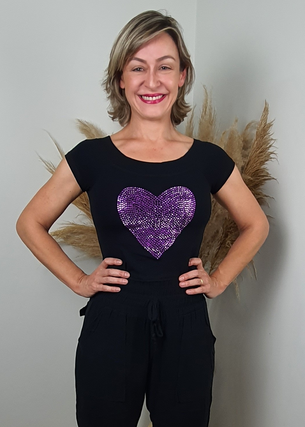Design Exclusivo: A estampa de coração roxo em pedraria é o ponto de luz da peça. As pedrarias, aplicadas com a tecnologia Hotfix termocolante, não descolam, garantindo que o brilho se mantenha por muito tempo.