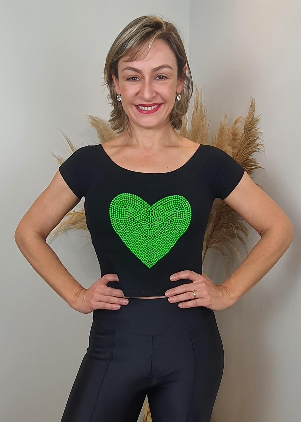 Cropped Feminino Viscolycra Preto Coração Verde Pedraria