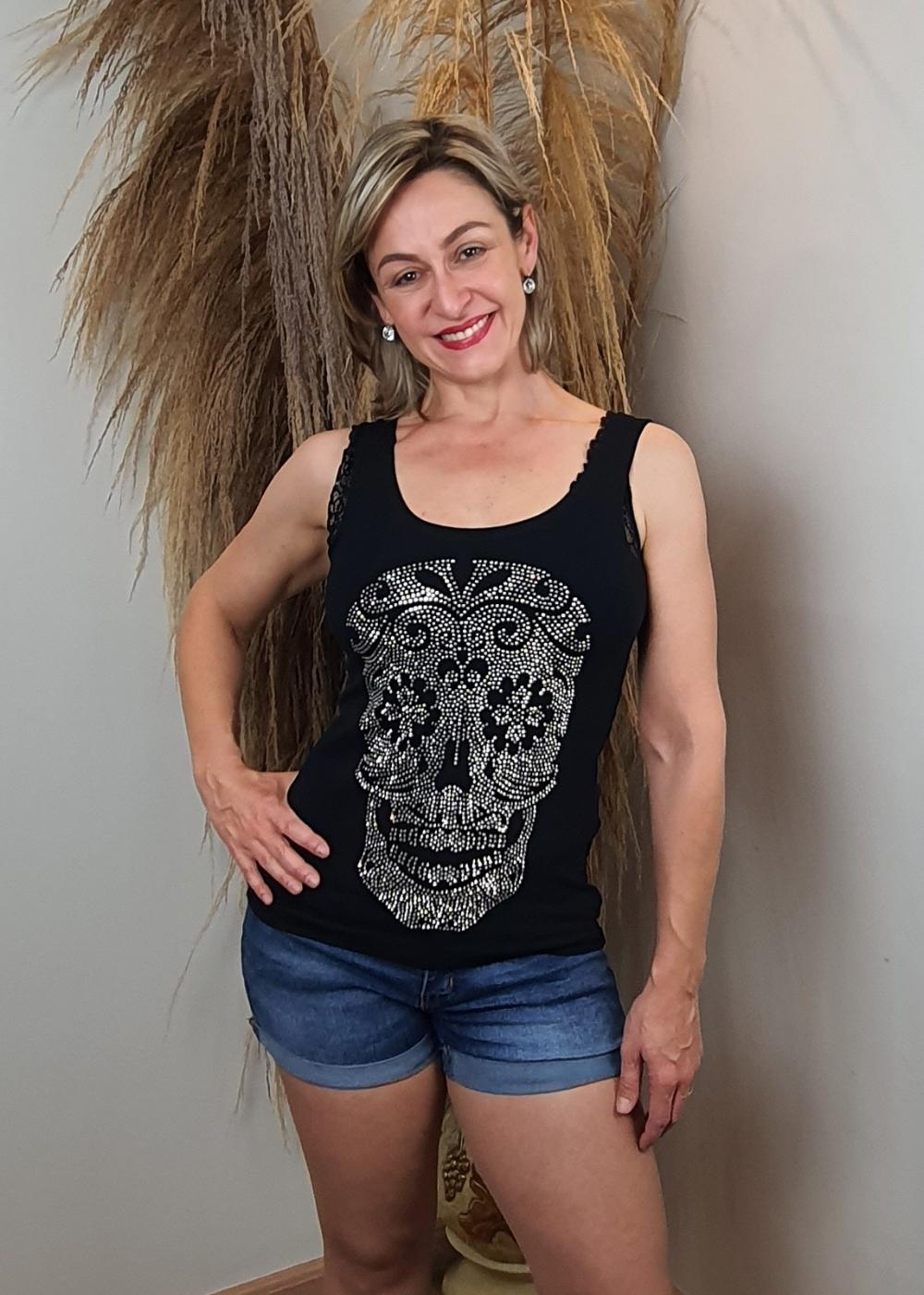 - Regata / Blusinha Feminina / T-shirt / Pedraria / Caveira Mexicana;