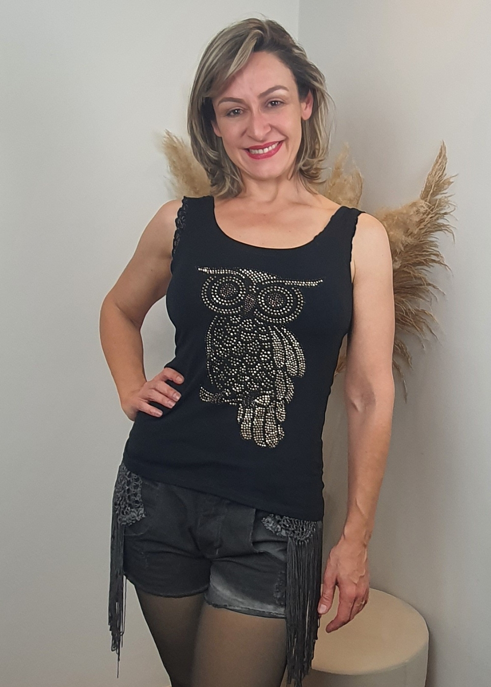 - Regata / Blusinha Feminina / T-shirt / Pedraria / Coruja Dourada;