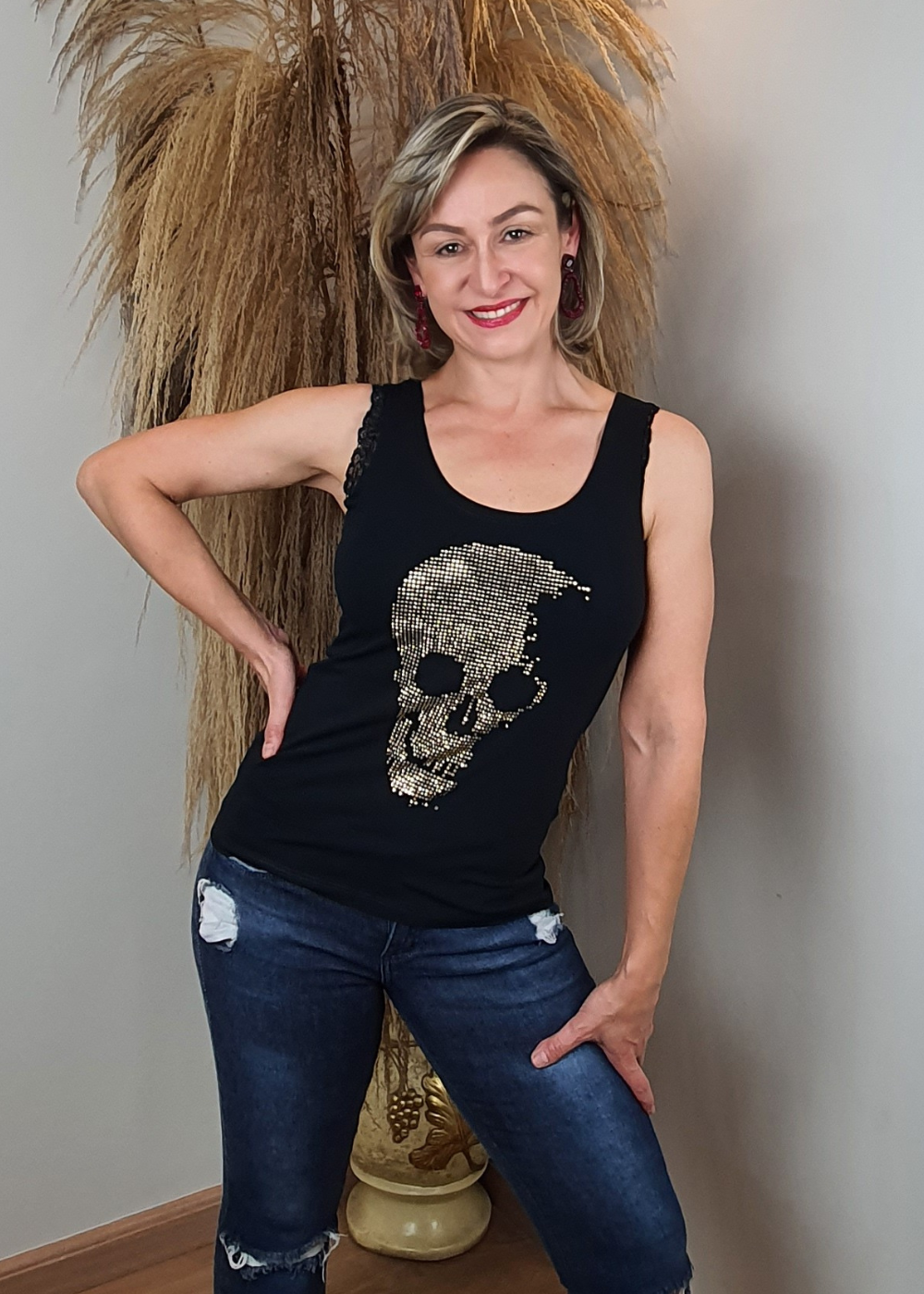 Regata Feminina Preta Meia Caveira Dourada Pedraria