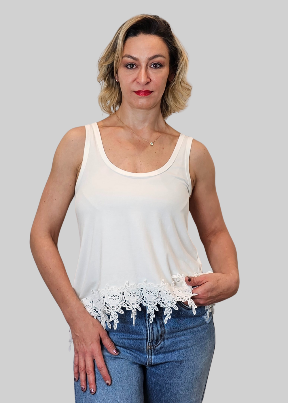 Deixe a paixão e a elegância florirem com a Regata Cropped Feminino Off White Basica Barra Renda. Adicione esta peça icônica ao seu guarda-roupa e sinta o poder ! ?✨