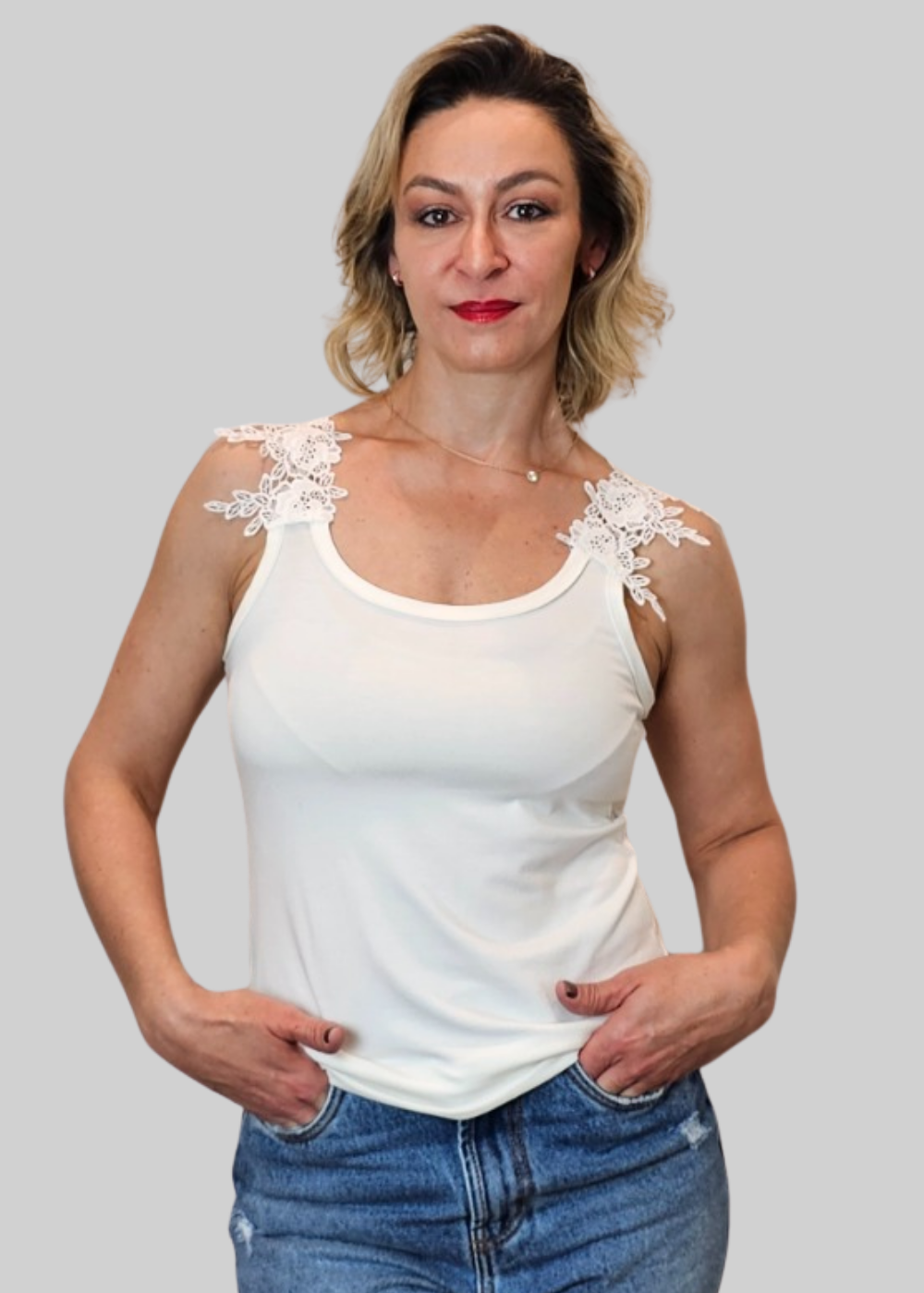 Ilumine seu estilo com a Regata Feminina Off White Basica Alça Renda