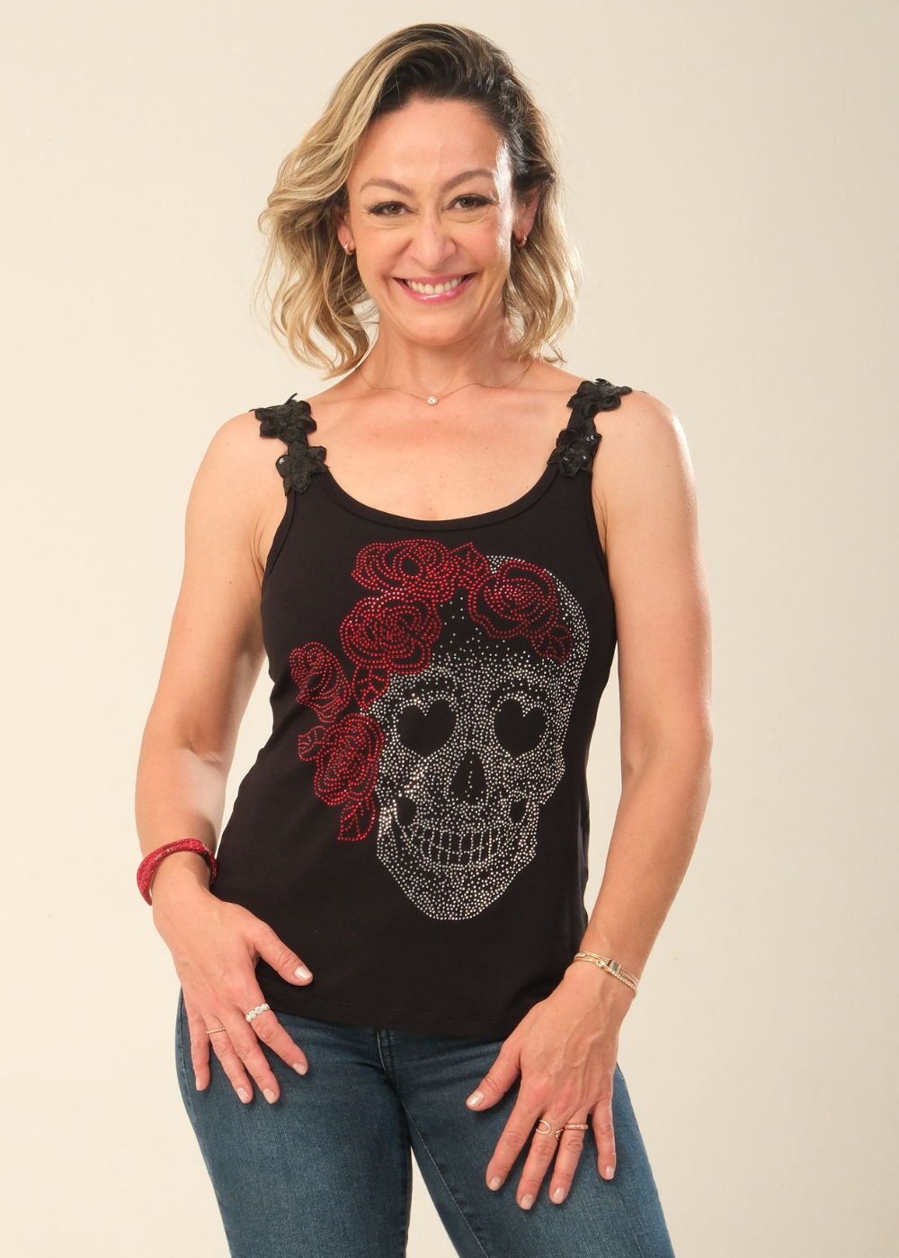 Encante-se com a ousadia e o estilo da Regata Feminina Pedraria Caveira com Rosas e Alça Flor e Paetê
