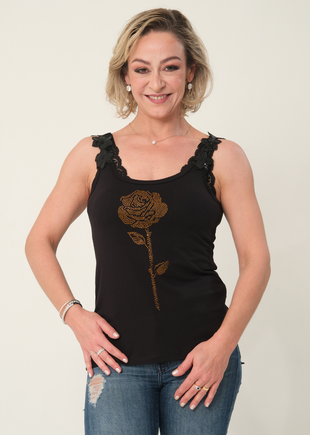 Brilhe com a sofisticação da Regata Feminina com Alça de Renda e Paetê/Flor com Pedraria de Rosa Dourada