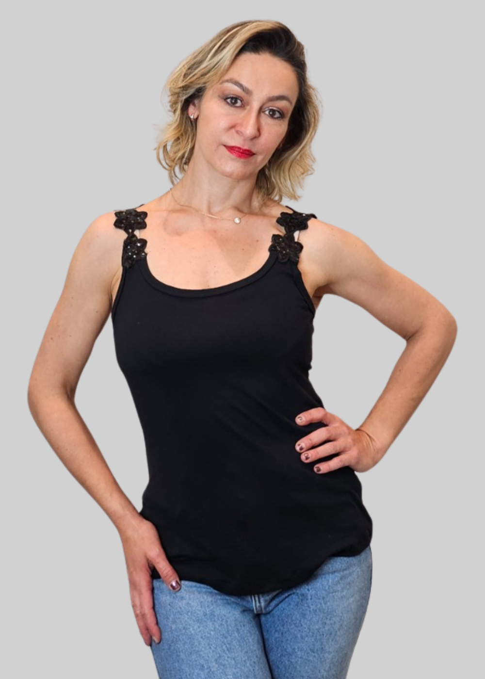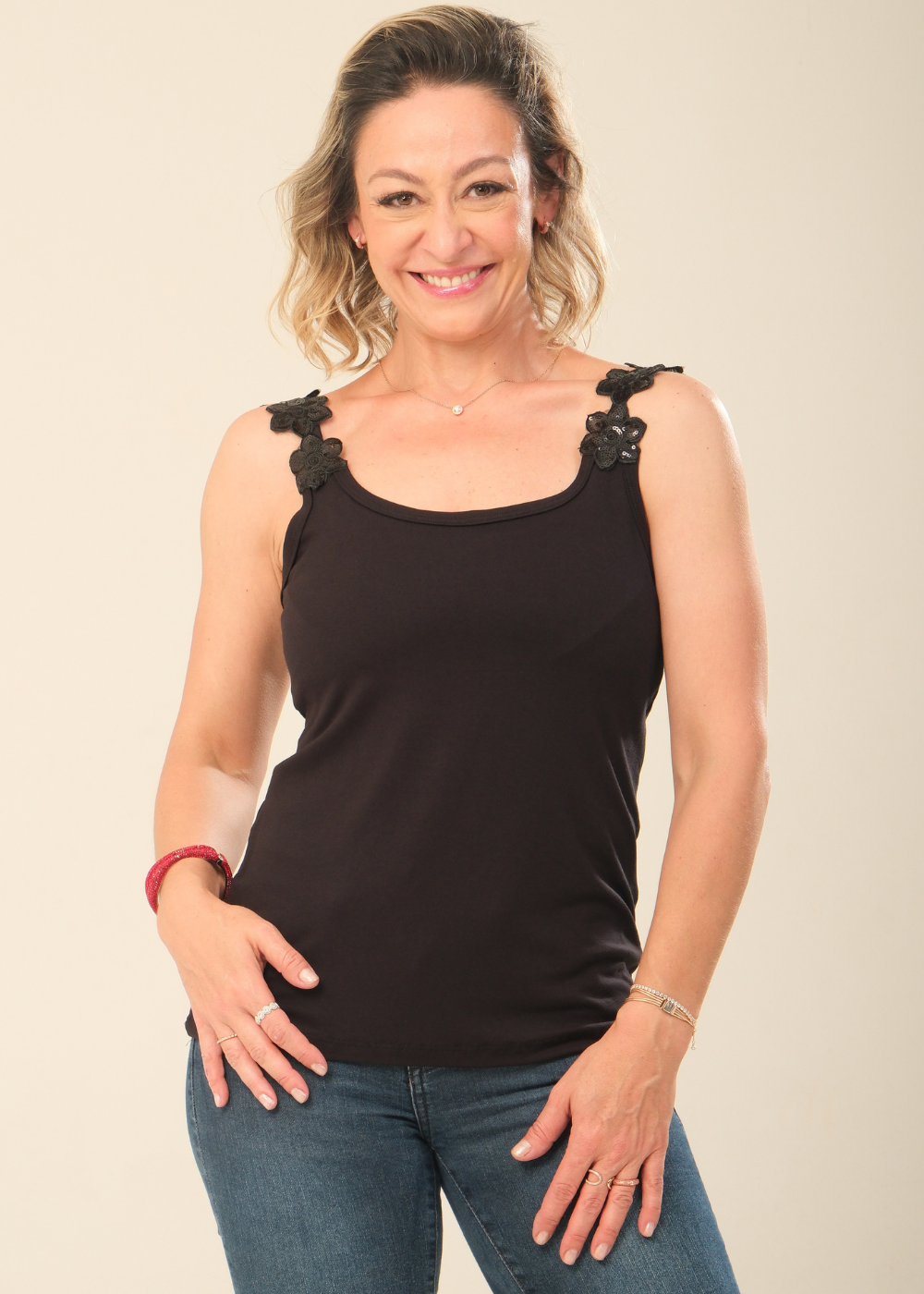 Brilhe com a sofisticação da Regata Feminina com Regata Feminina Preta Basica Alça Flor Paetê.