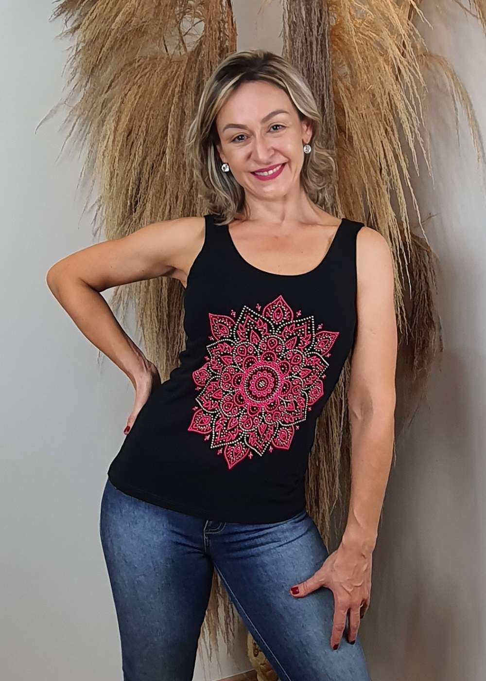 Regata Feminina Preta Mandala Flor Pink Pedraria
