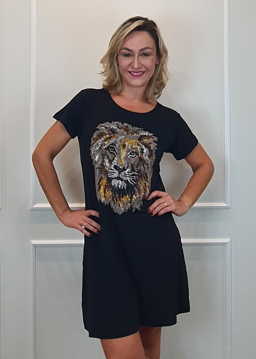Vestido Em Malha Preto Leão Colors Pedraria